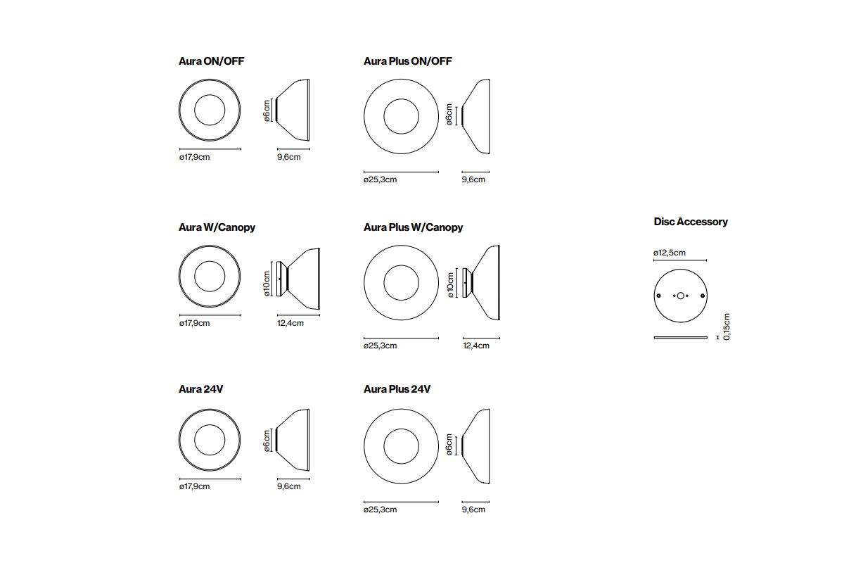 Aura je na voljo v dveh velikostih – s premerom 18 in 25 cm – da zagotovi svetlobne rešitve za manjše ali večje prostore. Ta lahka in močna stenska svetilka mora biti v idealnem razmerju z notranjostjo, ki jo mora osvetliti, razmerje pa je vedno odvisno od merila.
