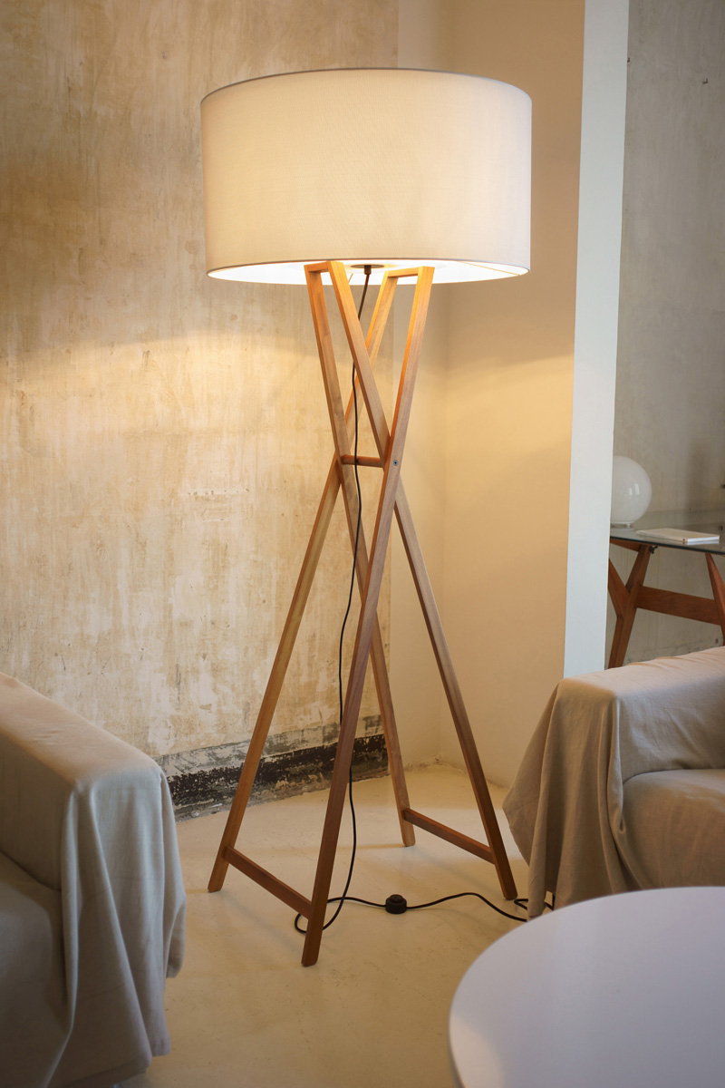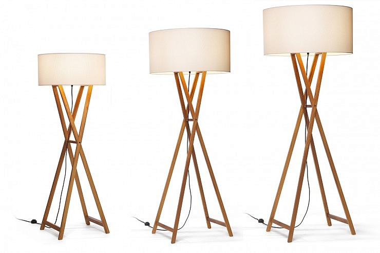 Talno svetilo z lesenima nogama in senčnikom iz tkanine, ki rzprši svetlobo.
