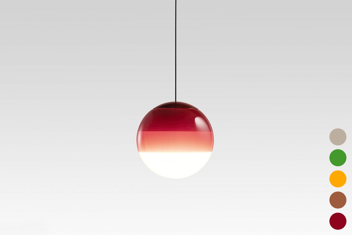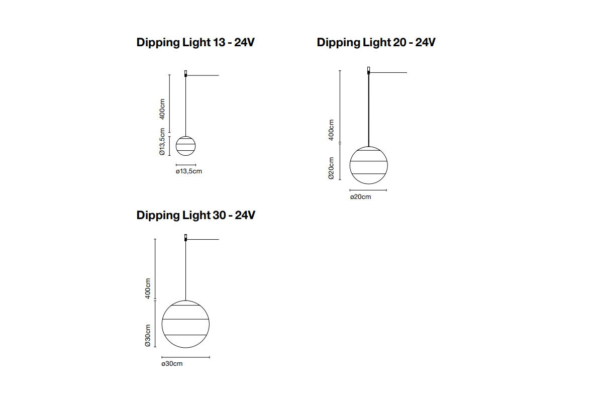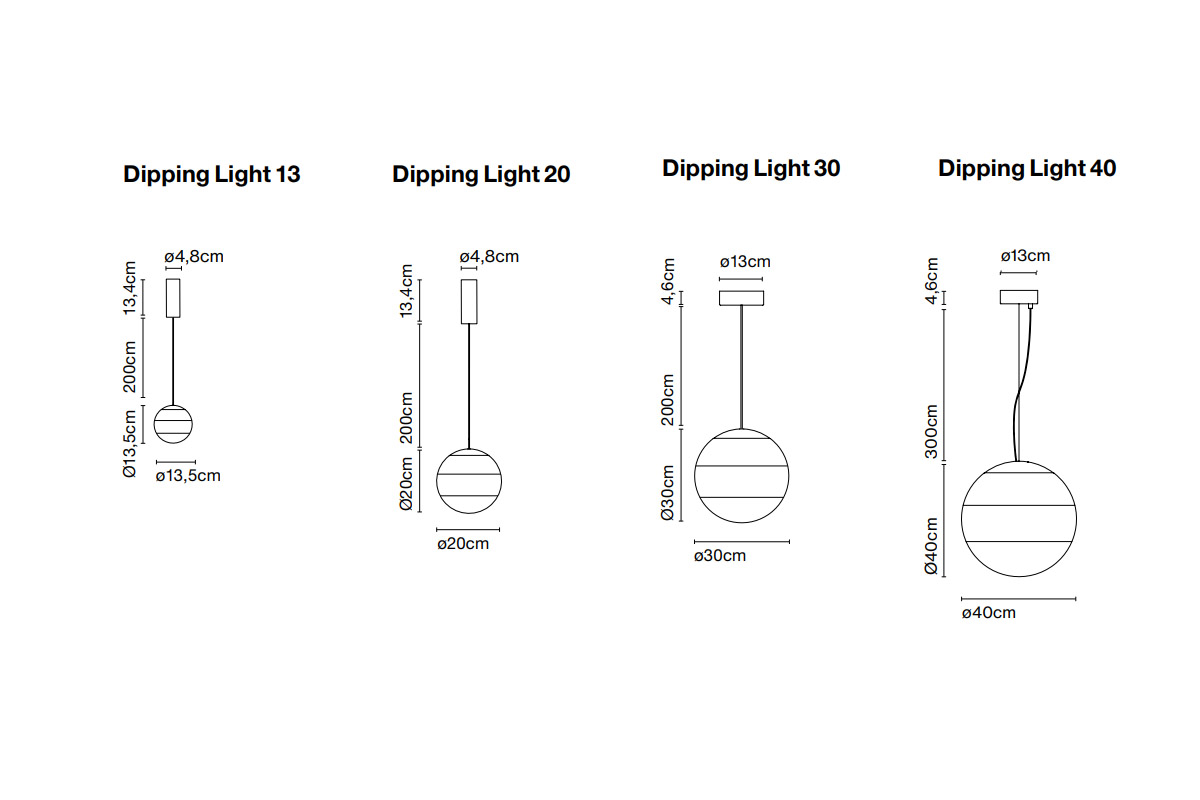 Viseča različica Dipping Light se znebi vseh nepotrebnih elementov in ohrani le bistveno: barva je v središču pozornosti. Pri uporabi več svetilk za ustvarjanje kompozicije je vizualni učinek očarljiv. Na voljo je v štirih različnih premerih: 12 cm, 20 cm, 30 cm in 40 cm. Ko je ta večja žarnica vklopljena, preprosto zahteva pozornost: barva je sporočilo. Njena velikost izžareva toliko moči in vizualne estetike, da lahko zapolni kateri koli prostor in ga potopi v barvo.