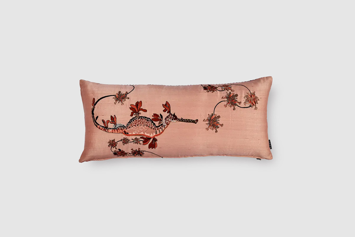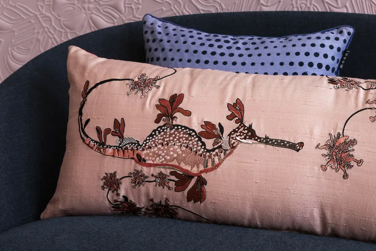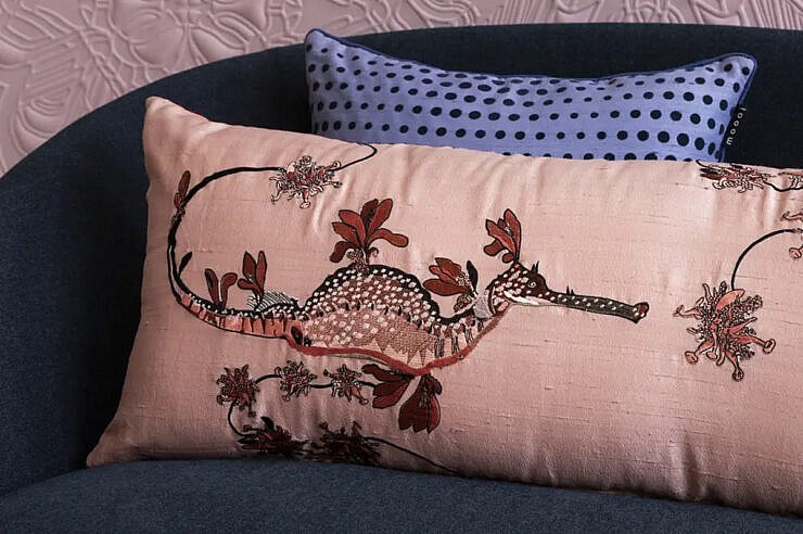 Dekorativna blazina Embroidered Blooming Seadragon je del Moooijeve kolekcije posteljnine Extinct Animals. Dizajn je navdihnjen s skrivnostnim Cvetočim morskim zmajem; izumrlo živaljo, ki je razvila spektakularne liste podobne priveske koralnih, rjavih in zelenih barv kot spretno obliko kamuflaže. Sprednja stran prikazuje čudovito izvezen Cvetoči morski zmaj, kar v kombinaciji z nežnimi barvami daje blazini bujen in čaroben občutek. Hrbtna stran blazine je okrašena s pikčastim vzorcem v jatnem tisku.