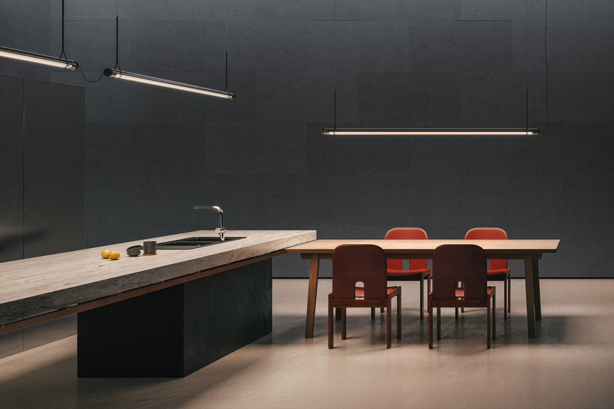 Risanje tankih svetlobnih snopov v prostoru, pri čemer je vsak od njih usmerjen v katero koli smer. Zato smo ustvarili Fris, večnamenski sistem razsvetljave, ki je na voljo v stenski/stropni ali viseči različici in vam omogoča kombiniranje več enot različnih velikosti in položajev, pri čemer vsaka usmerja svoj svetlobni snop. Njegova zasnova je sestavljena iz steklene cevi, ki obdaja svetlobo. Edinstvena je po tem, da steklo ne le ščiti svetlobo, temveč zagotavlja tudi mehansko funkcijo, saj obeša celoten sistem in omogoča vrtenje svetilke ter usmerjanje svetlobe v določeno smer. Posledično je steklo hkrati material in funkcija. Skozi prozorno steklo vidimo notranjost svetilke, ki je sestavljena iz dveh profilov: eden vključuje vir svetlobe, drugi pa deluje kot parabola, ki projicira ostro, intenzivno svetlobo. Več o svetilu...