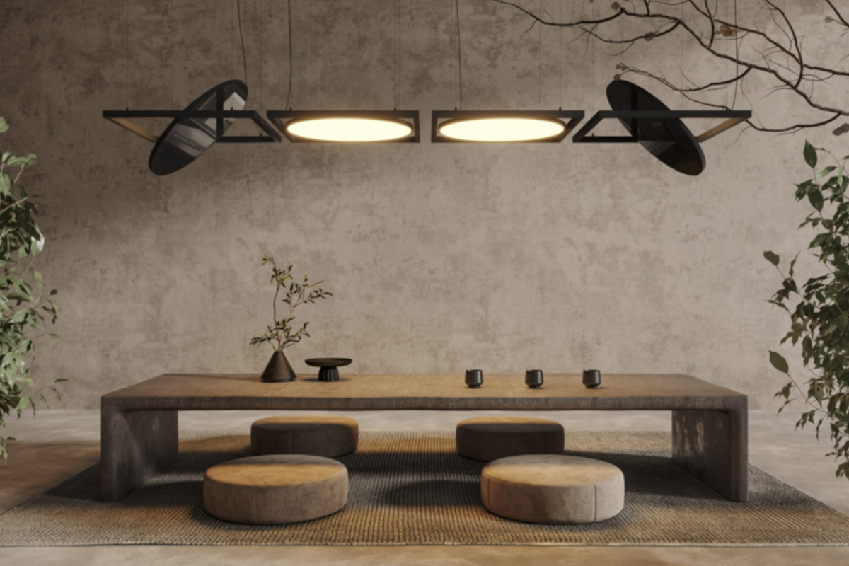 Svetilo Geometrija spreminja čiste oblike v dialoge z okoljem. Kljub svoji voluminozni prisotnosti vzbuja neverjeten občutek lahkotnosti in zračnosti. Tanek in lebdeč svetlobni disk, se zliva z okolico in jo hkrati oblikuje.