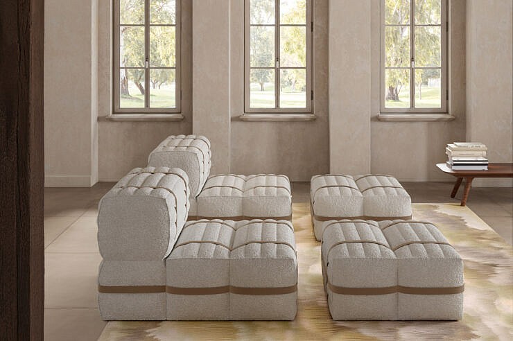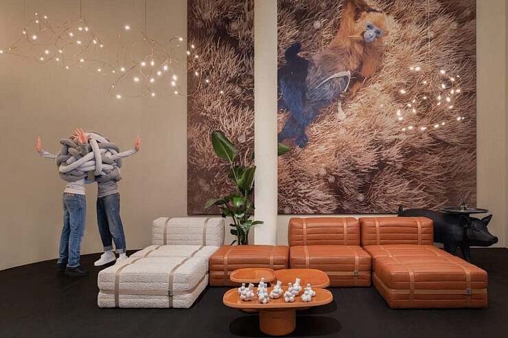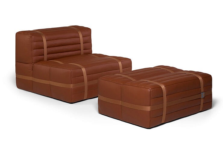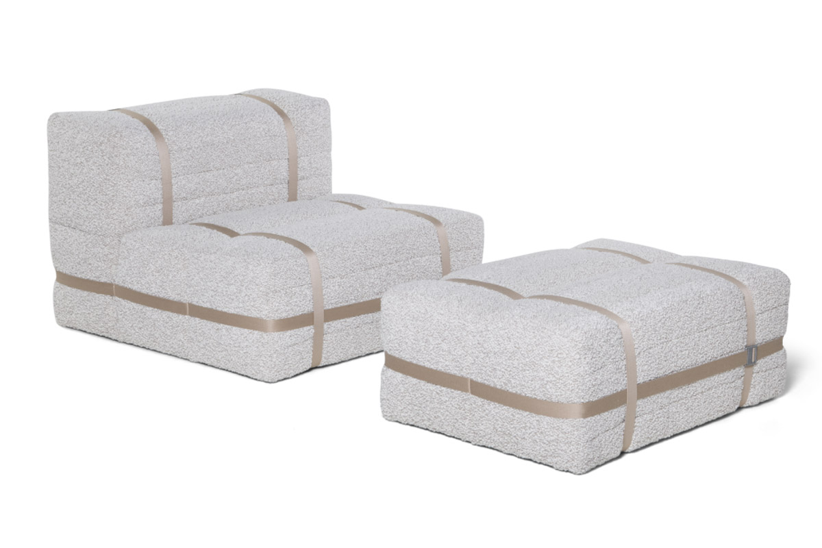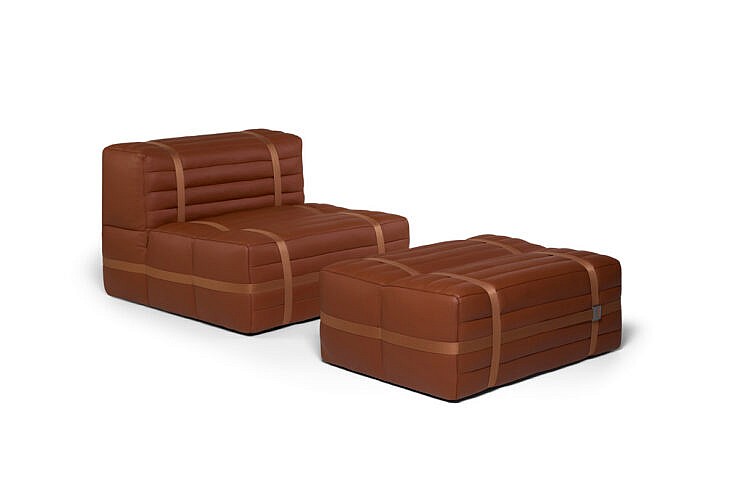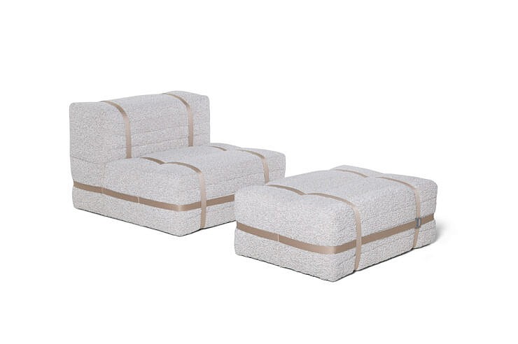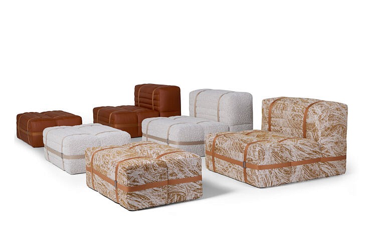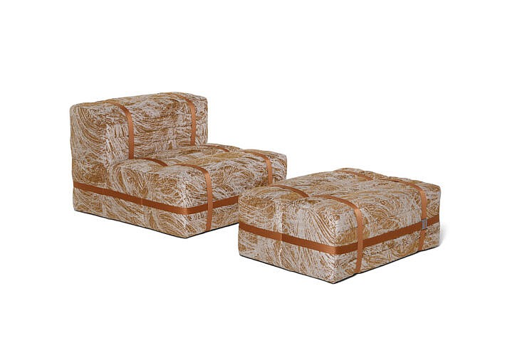 Drzna reinterpretacija podeželske nostalgije, Haybale Lounge Chair with Footstool Nicholasa Bakerja, spreminja zložene bale sena v kiparsko izjavo udobja. Plišaste, prešite blazine, pritrjene z drznimi trakovi, spominjajo na praktičnost kmečkega življenja, izdelane s skrbno pozornostjo do oblike in funkcije. V kompletu z ujemajočim se stolčkom njegova modularna zasnova vabi tako k igri kot k sprostitvi.