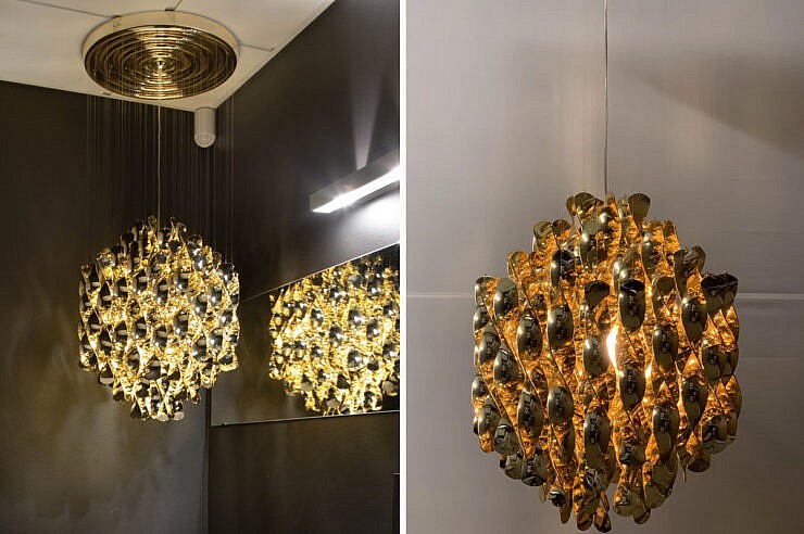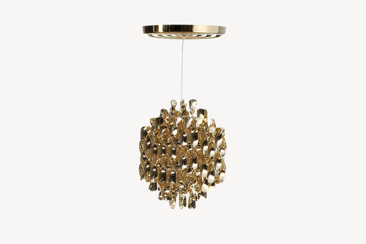 Spiral SP1 Gold je velika viseča stropna svetilka z eno samo skupino zlatih spiral.