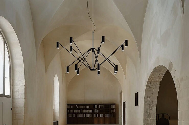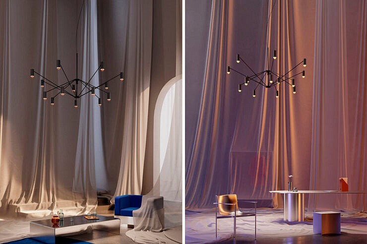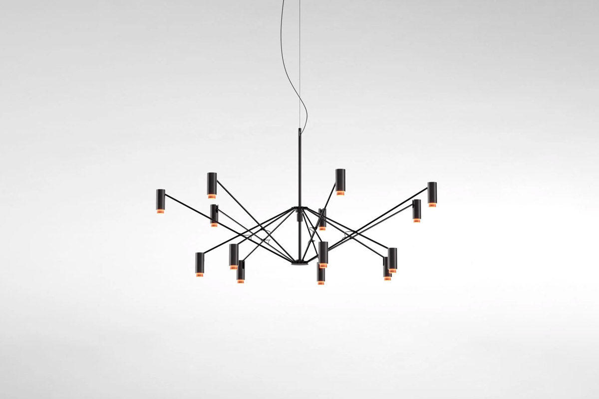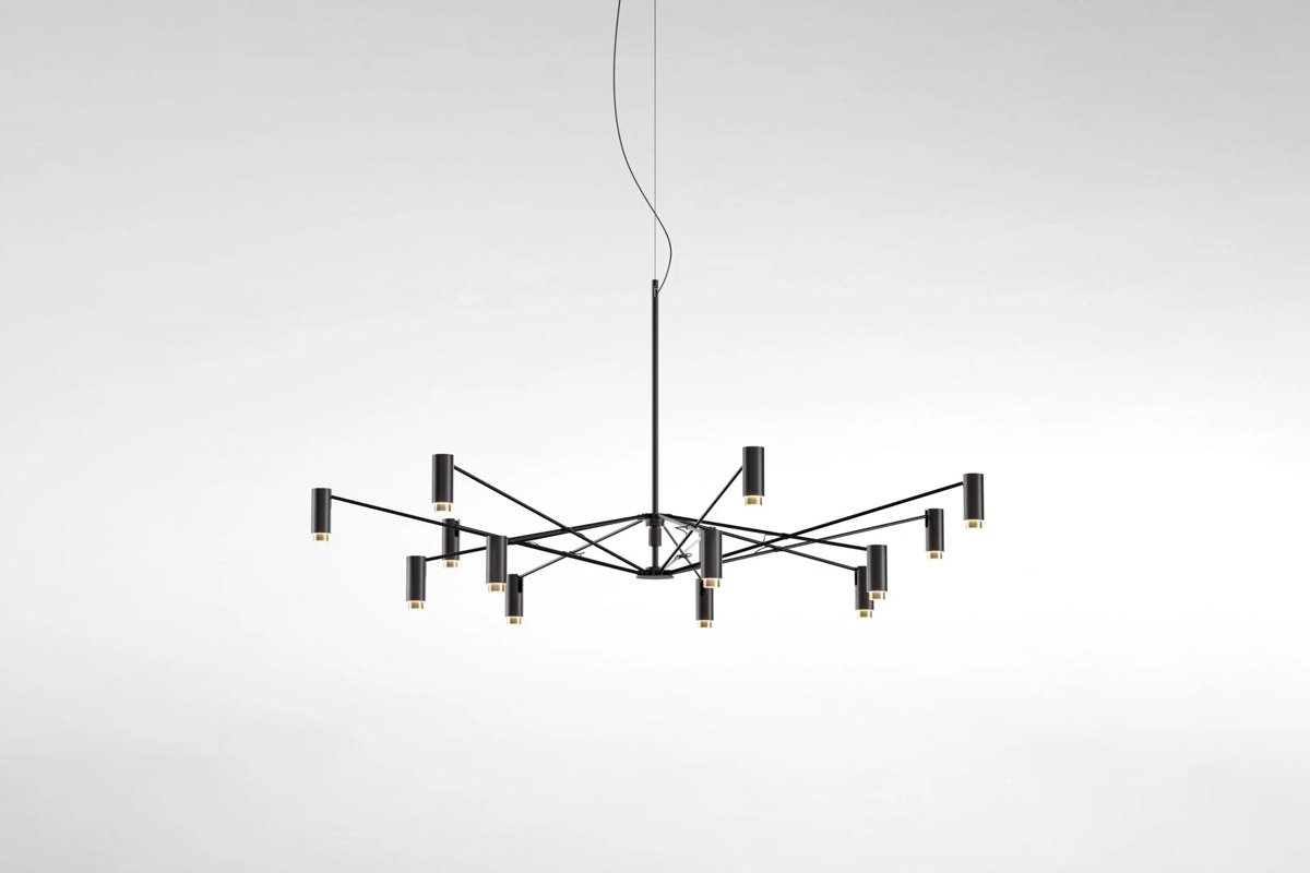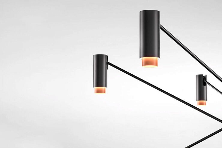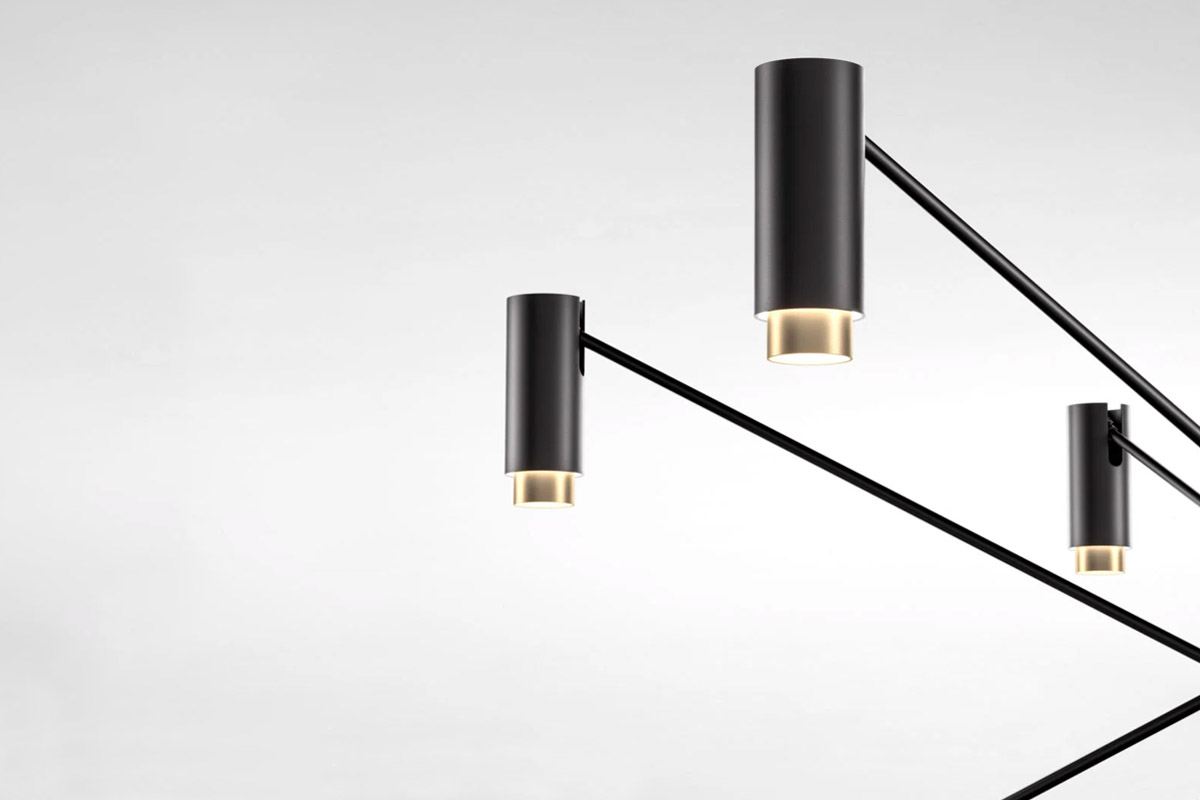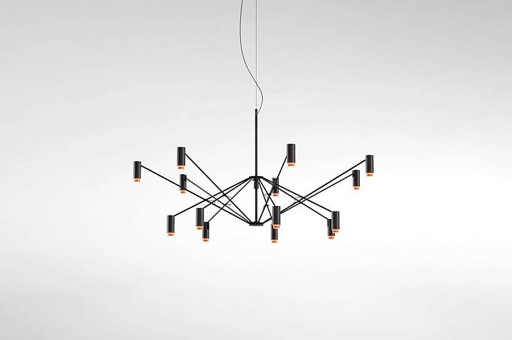 Velika črna navpična struktura je glavna gred, iz katere izhajajo številne palice; nekatere lahko premaknete navzgor, da razširite svetlobo, druge pa navzdol, da jo osredotočite. Vse palice imajo obešen reflektor, ki projicira svetlobo navzdol ali v velikem, ostrem žarku. Cilindrični reflektorji – z notranjim obročem v barvi slonovine, terakote ali zlata – enakomerno širijo svetlobo.