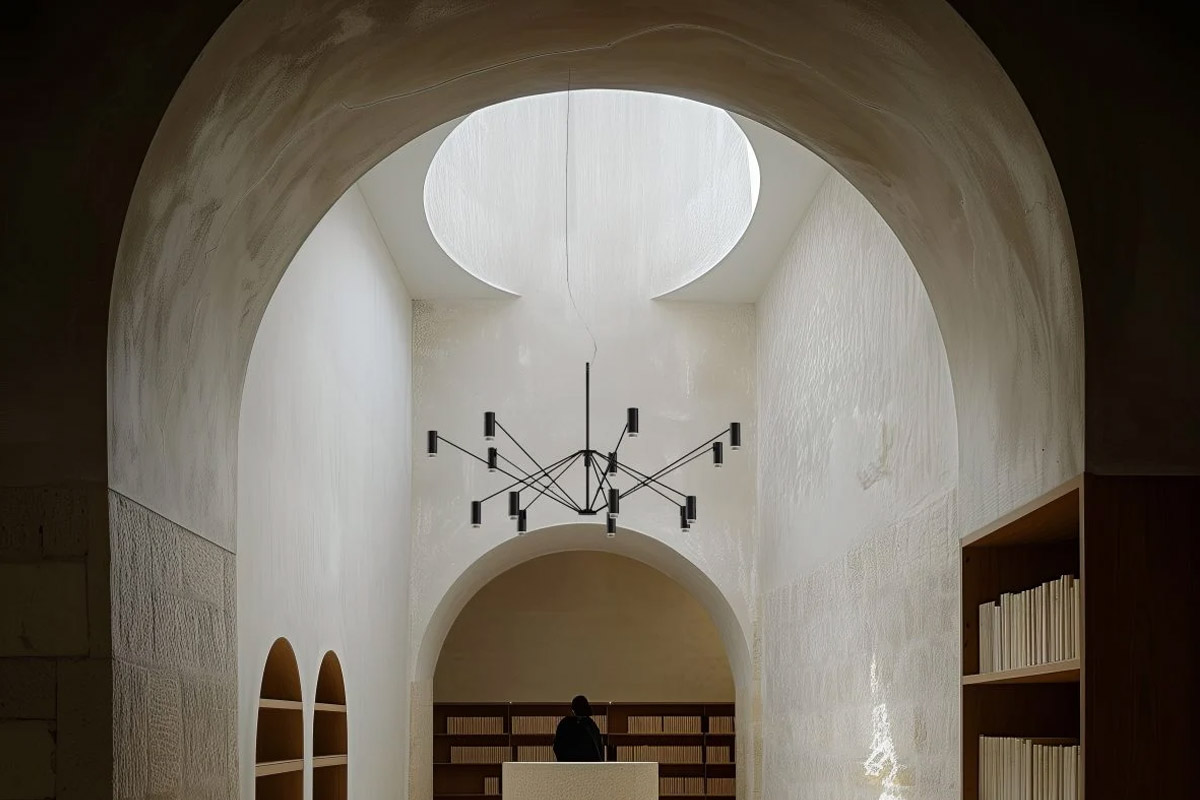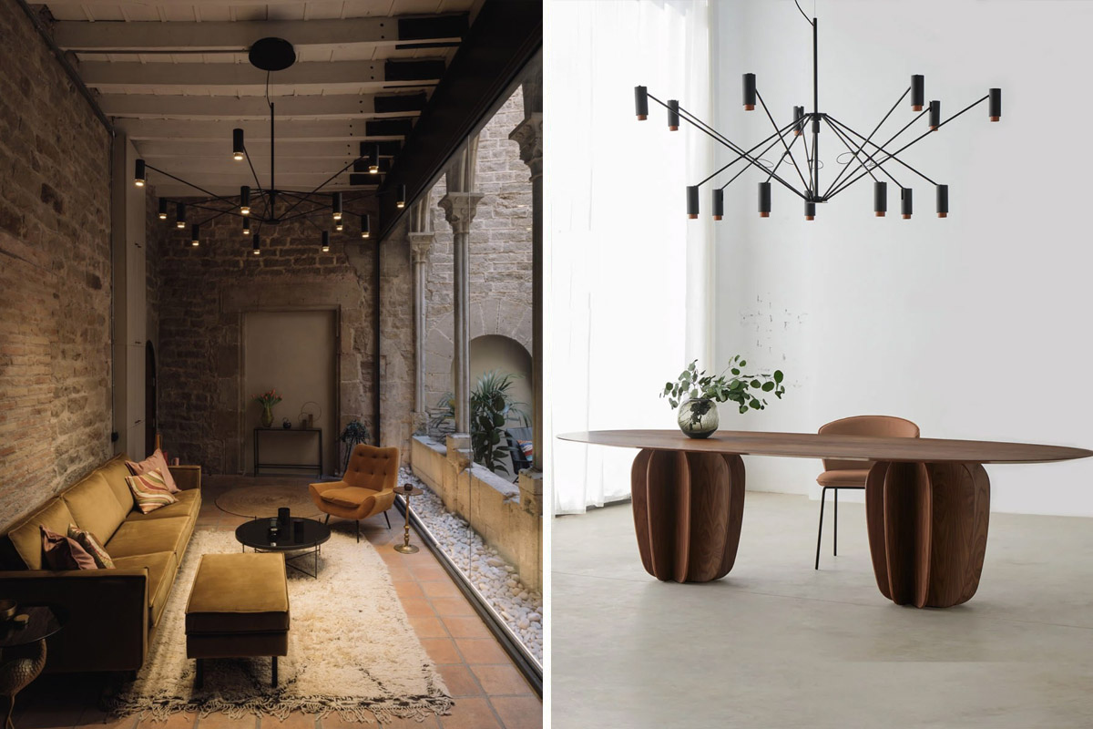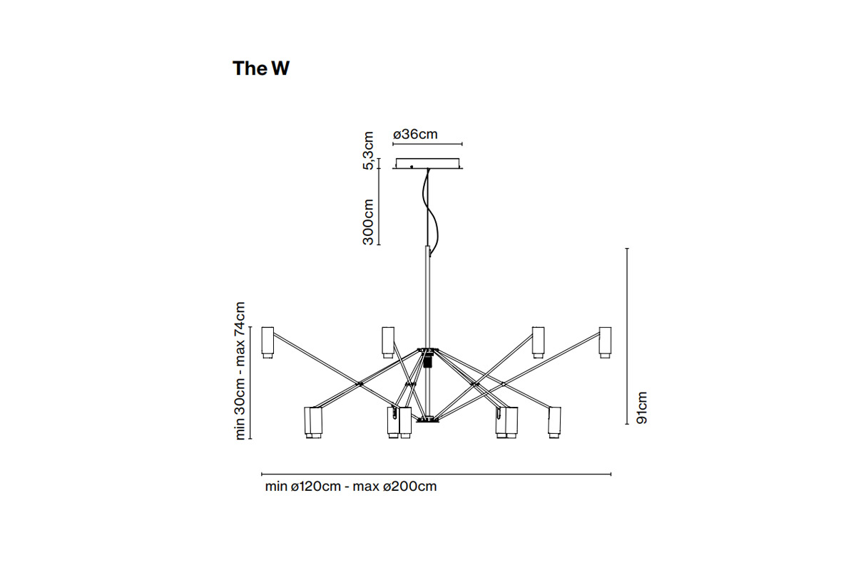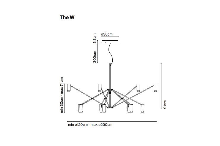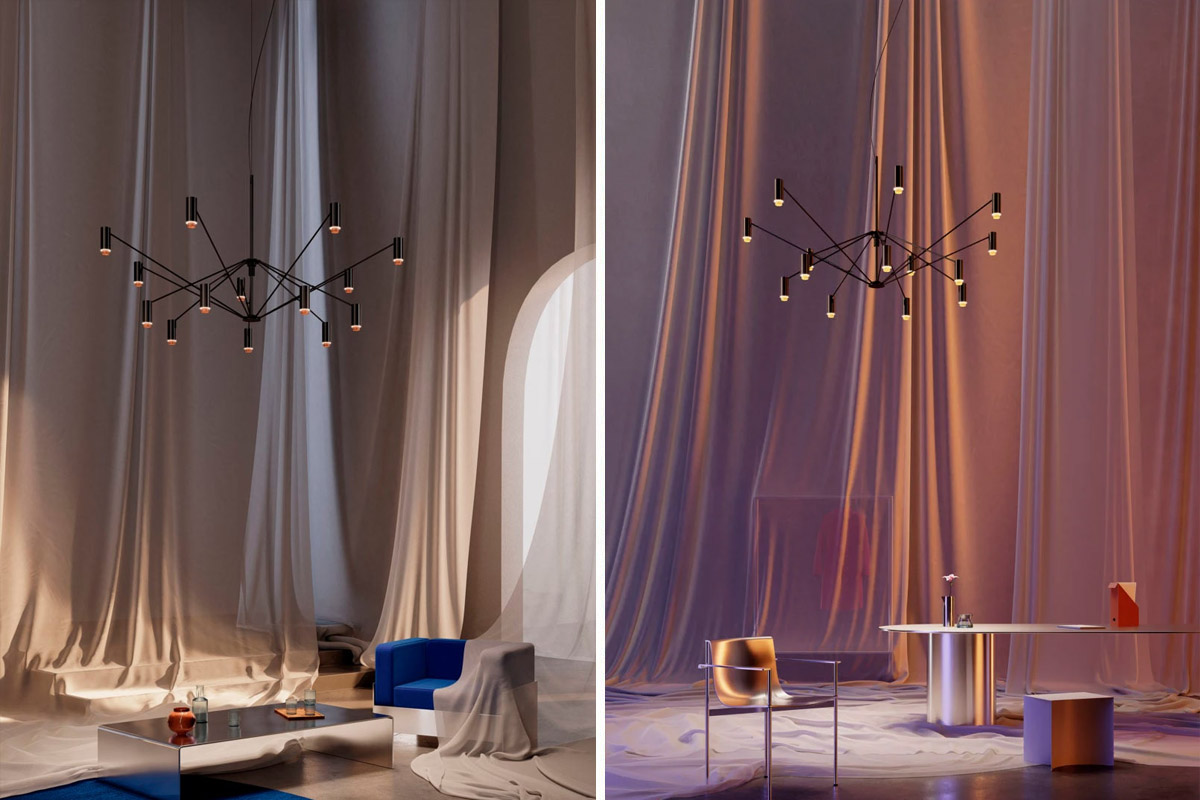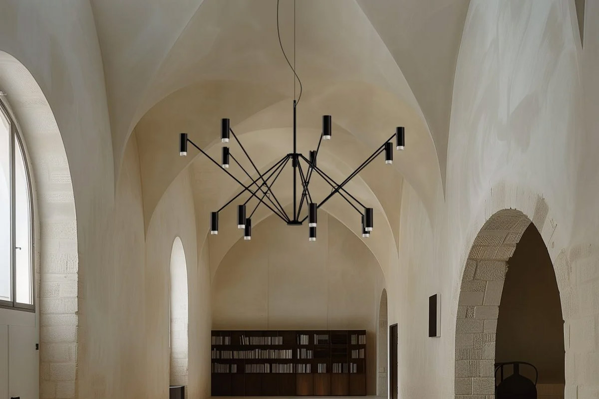 Velika črna navpična struktura je glavna gred, iz katere izhajajo številne palice; nekatere lahko premaknete navzgor, da razširite svetlobo, druge pa navzdol, da jo osredotočite. Vse palice imajo obešen reflektor, ki projicira svetlobo navzdol ali v velikem, ostrem žarku. Cilindrični reflektorji – z notranjim obročem v barvi slonovine, terakote ali zlata – enakomerno širijo svetlobo.