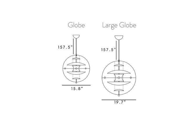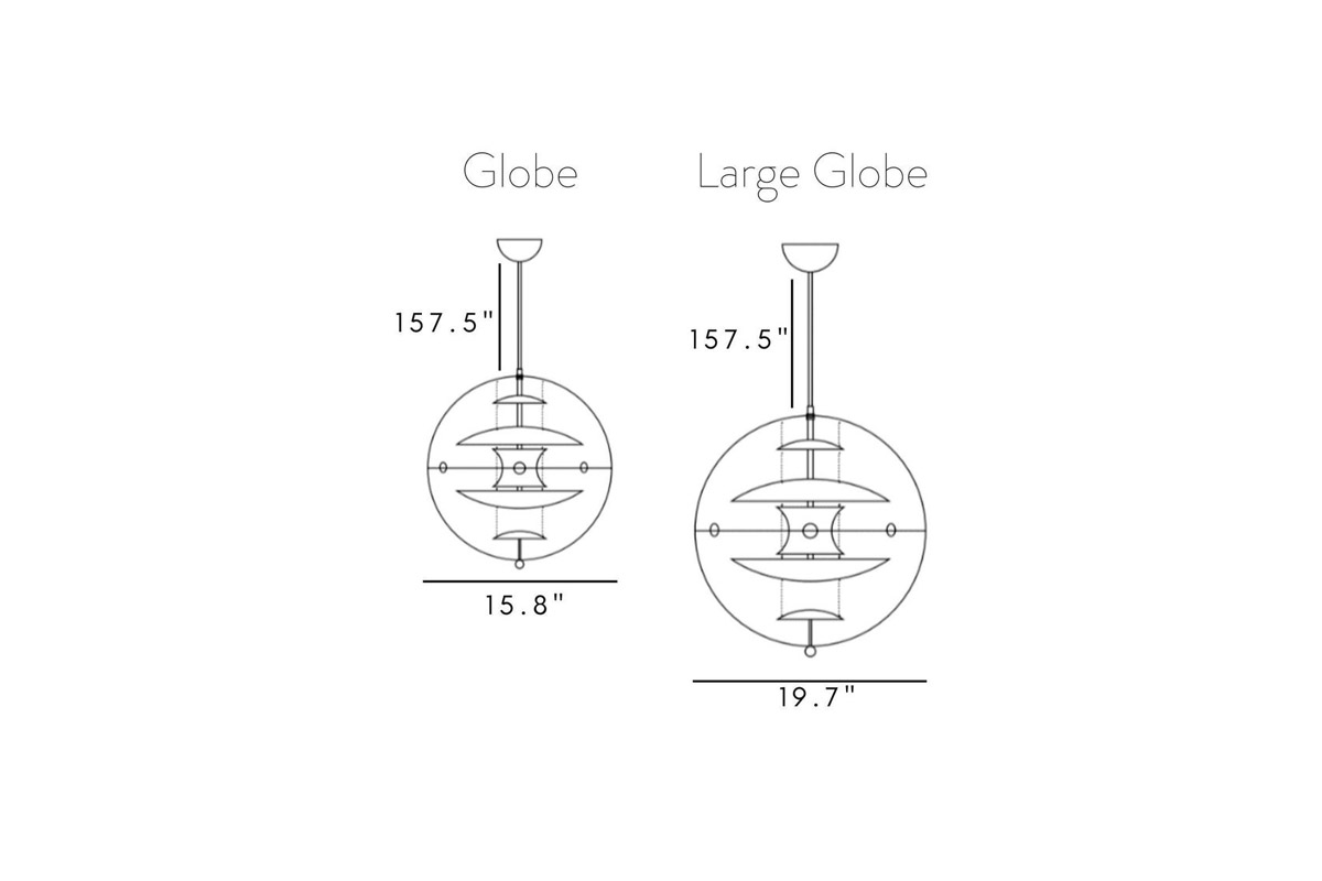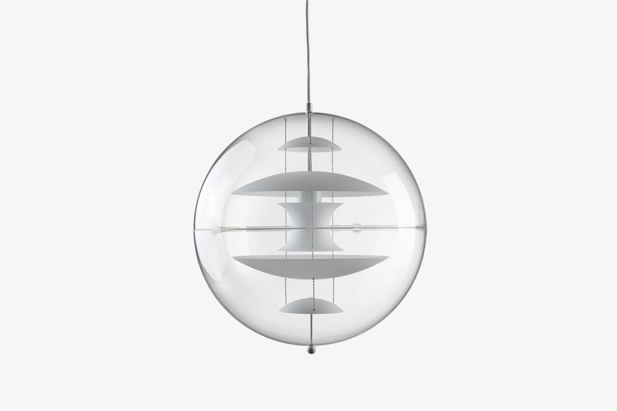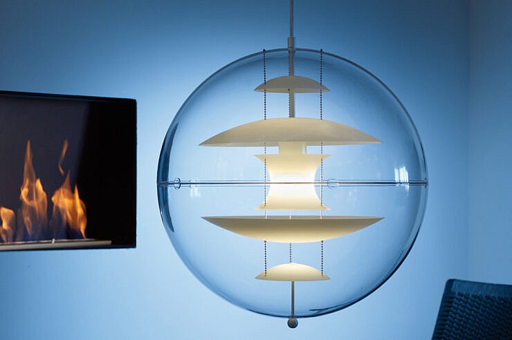 Ta dekorativna viseča svetilka VP Globe Glass ima kristalno čisto, prozorno akrilno zunanjo kroglo s petimi notranjimi reflektorji, ki jih obešajo tri jeklene verige. Reflektorji iz opalno belega stekla omogočajo, da svetloba zlahka prodre skozi. Pantonova ambicija z VP Globe je bila oblikovati svetilko, ki bi pritegnila pogled in združila prostor, ne glede na to, ali visi samostojno ali v skupinah. Zaradi tega je viseča svetilka idealna izbira nad jedilno mizo, na hodniku ali dolgem hodniku ali kot kiparski element v kotu.