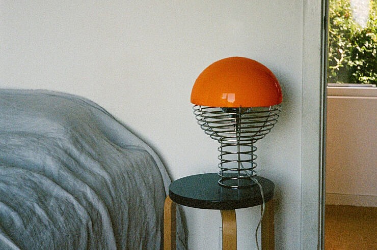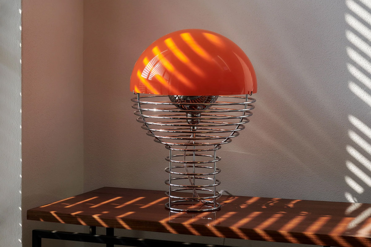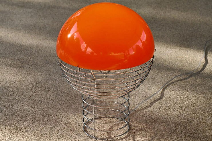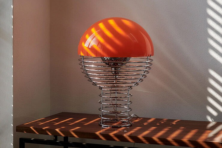 Dekorativno namizno svetilko Wire definira kromiran okvir iz jeklene žice, ki se na vrhu razširi in podpira oranžen polkrogel plastični senčnik. Žarnica je nameščena v majhnem, prav tako polkrogelnem kovinskem reflektorju, ki usmerja svetlobo v notranjost senčnika. Žični okvir daje dizajnu značilen, a zelo lahek in nevsiljiv videz, beli senčnik pa ponuja veliko ambientalne svetlobe.